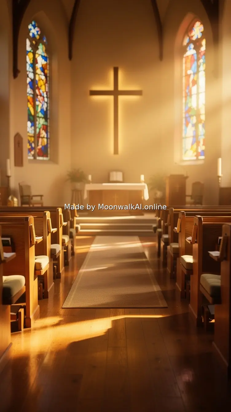 Warm, inviting church interior with soft lighting, wooden pews, and a cross visible in the background. Photorealistic style with golden hour lighting streaming through stained glass windows creating a peaceful, welcoming atmosphere.