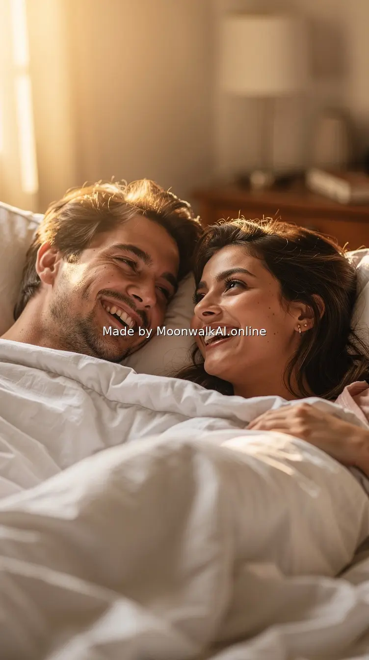 Happy couple lying in bed together, both smiling and laughing, post-intimacy glow, messy sheets, warm morning light, genuine happiness and connection
