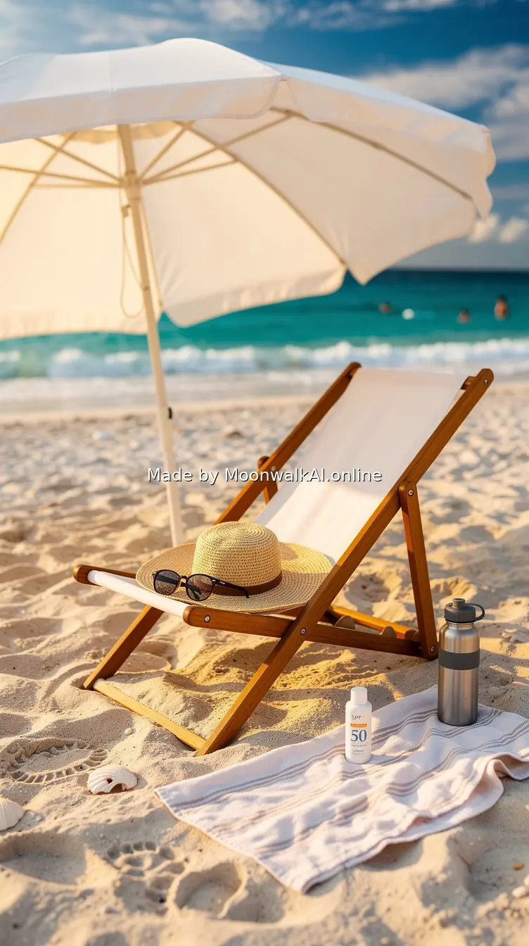 Beach scene with large umbrella providing shade, wide-brimmed sun hat and sunglasses on beach chair, photorealistic lifestyle shot showing complete sun protection setup