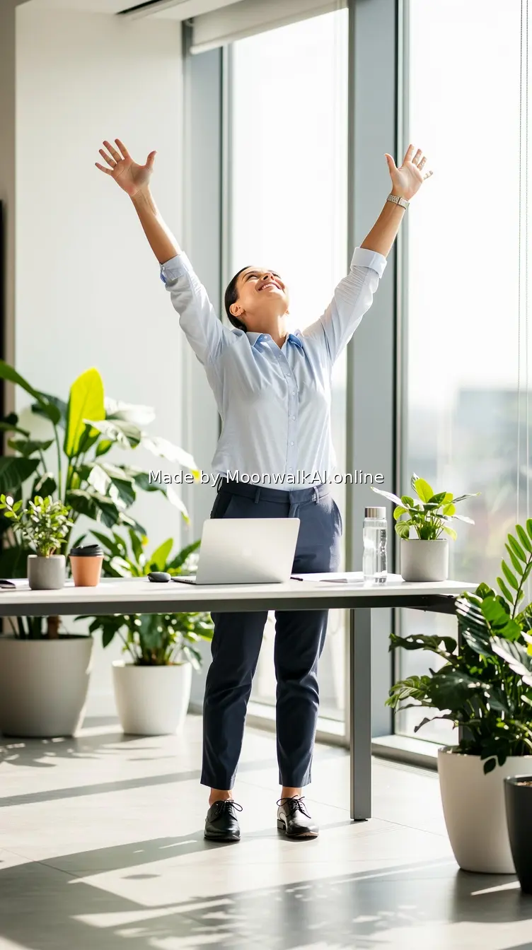 Photorealistic image of a professional standing at their desk, arms stretched upward, smiling with relief, bright office with large windows, plants visible, energizing atmosphere, natural daylight