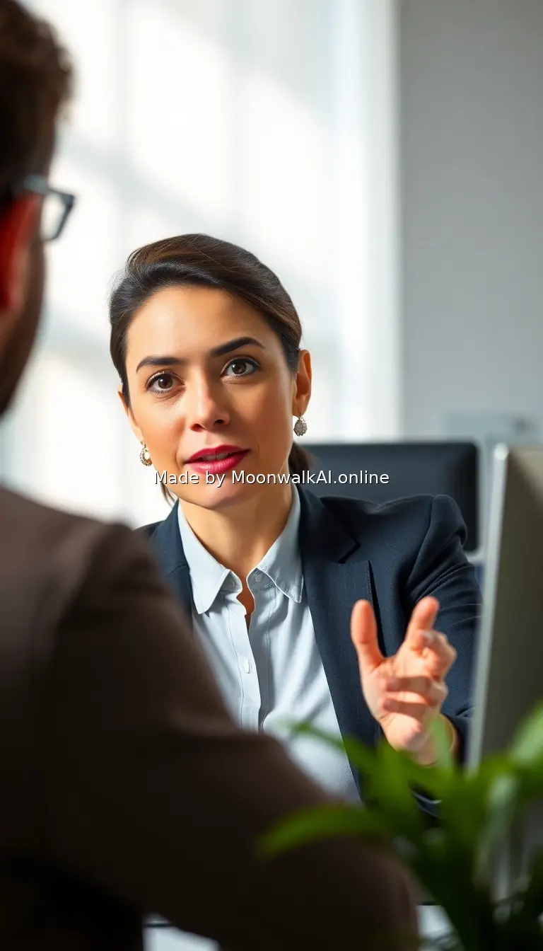 Professional confidently speaking to colleague or on video call, calm assertive expression, organized desk with single focused task visible, natural office lighting, realistic workplace empowerment moment