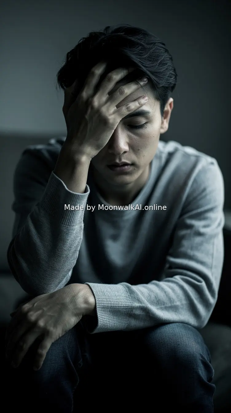 Person sitting alone looking distressed and contemplative, hand on forehead, dim lighting suggesting emotional difficulty, isolated feeling