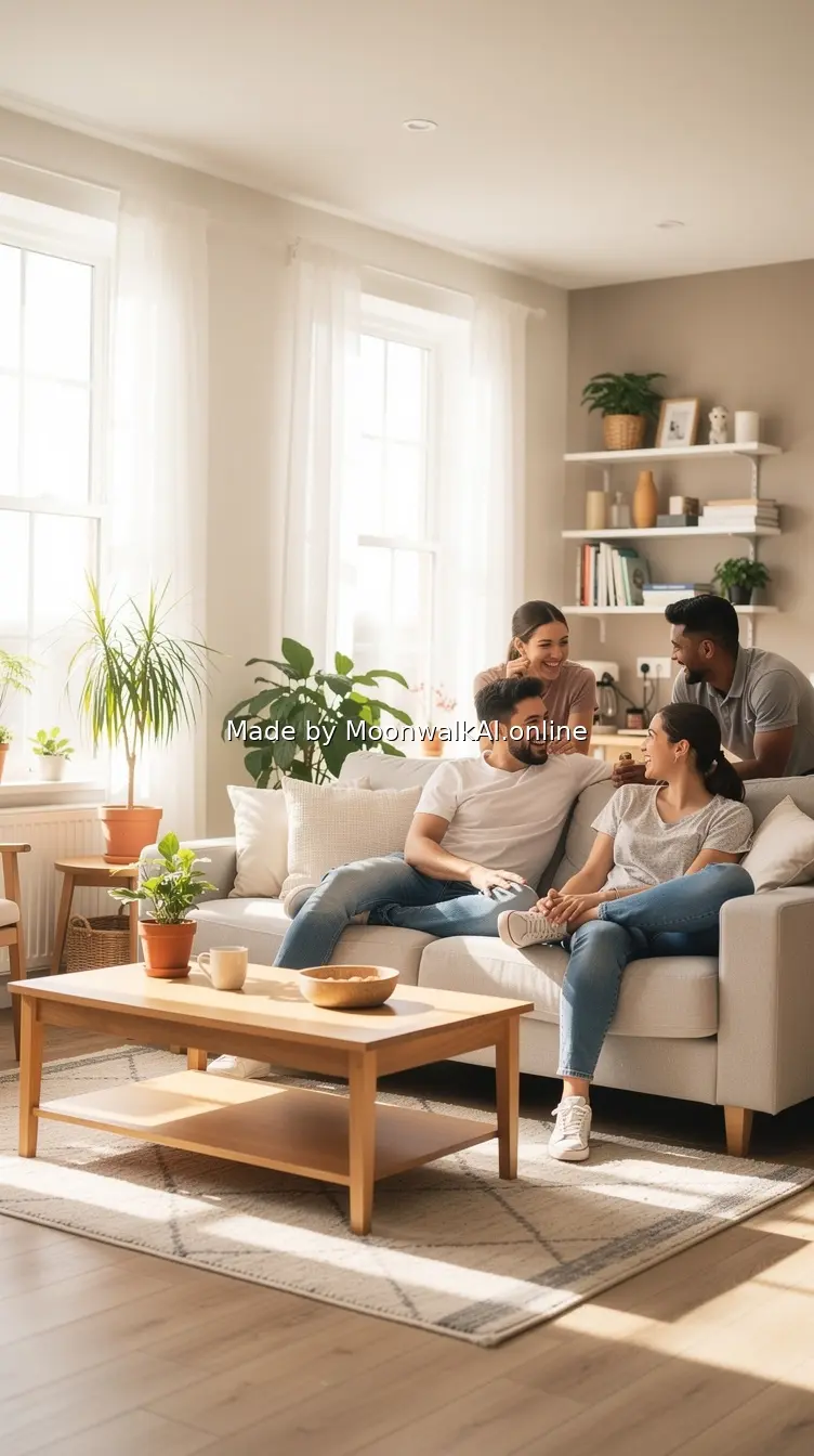 Photorealistic image of a clean, organized shared living space with happy roommates in the background, showing a positive outcome of good communication and boundaries