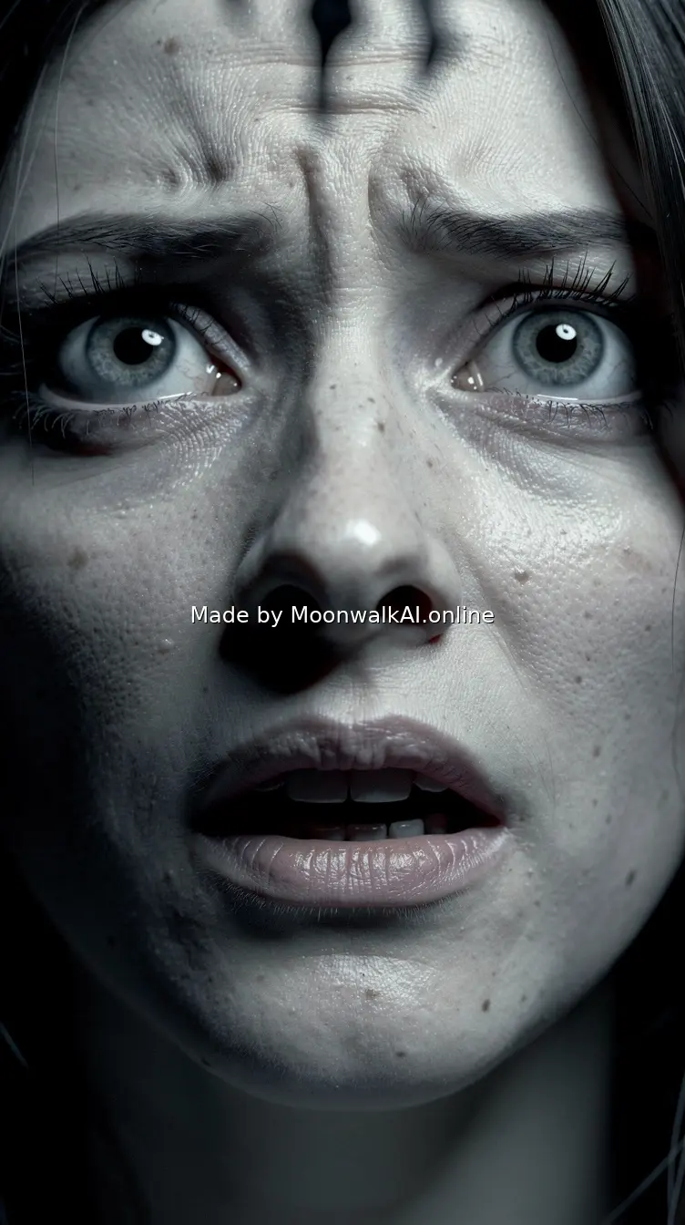 Horrified woman's face in extreme close-up, eyes wide with terror looking upward, mouth slightly open in shock, dramatic lighting from below casting ominous shadows, photorealistic horror movie style