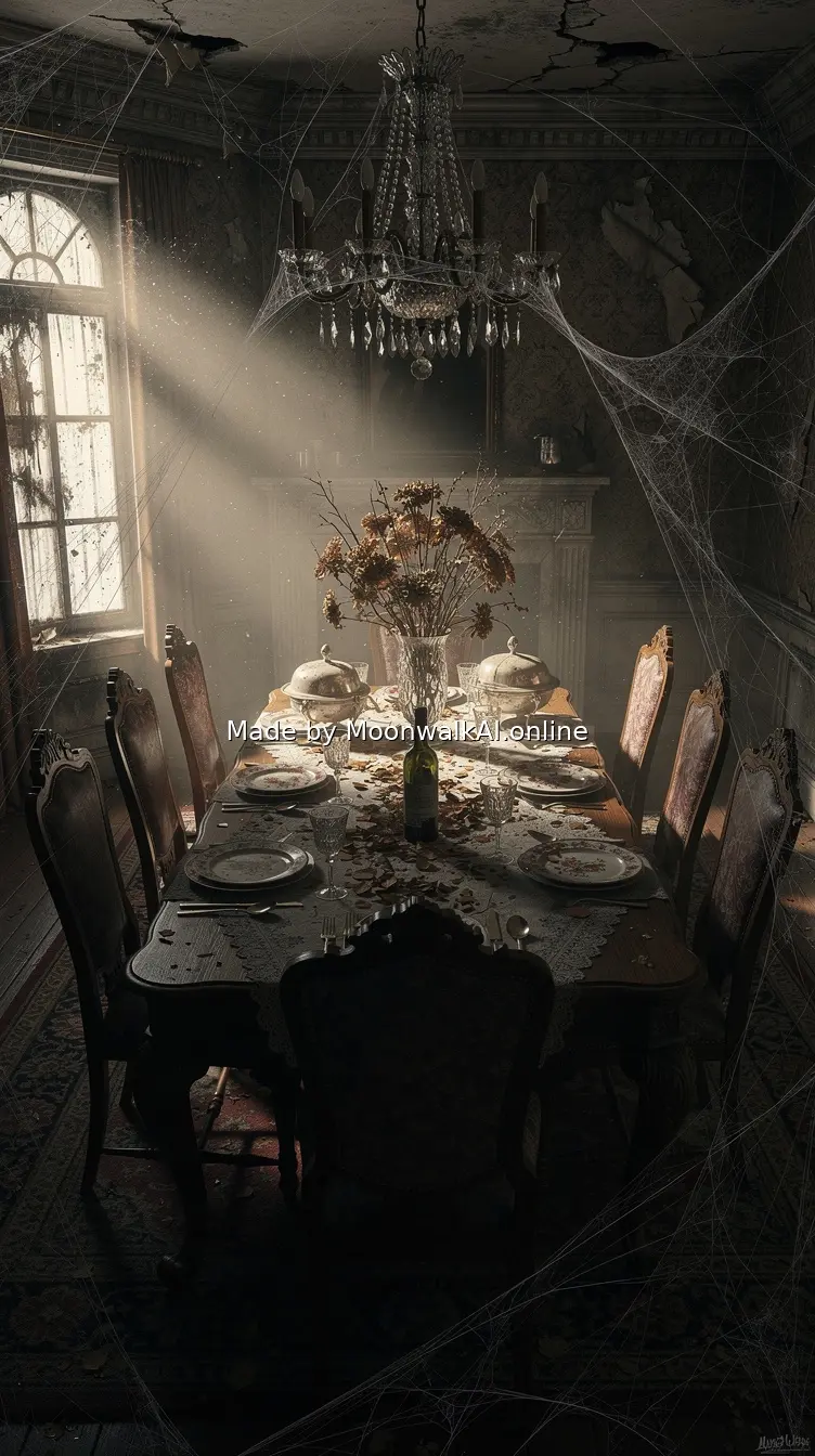 Abandoned Victorian dining room with elaborate table still set for dinner, dusty fine china plates, tarnished silverware, dried dead flowers in crystal vase, ornate chairs pushed back as if people just left, cobwebs connecting chandelier to table, dramatic window light creating eerie atmosphere, photorealistic decay details, untouched meal setting from decades ago