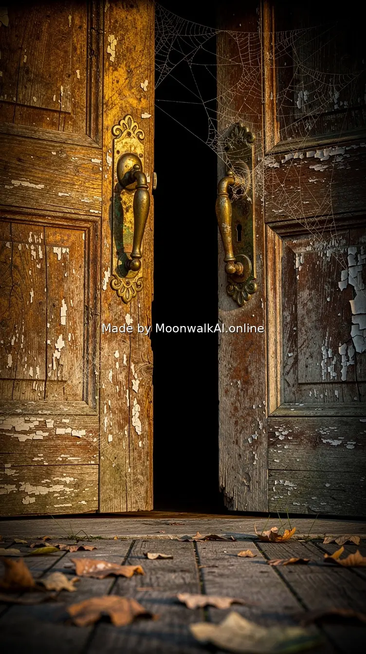 POV perspective looking at a massive wooden front door with peeling paint and ornate brass handles, partially ajar revealing darkness inside. Cobwebs stretch across the doorframe, and fallen leaves scatter on the weathered porch. Realistic detail showing texture of aged wood grain and rust on metal fixtures.