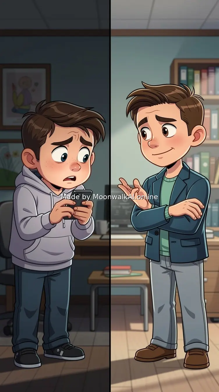 The friend character looking confused and distressed, phone in hand again, while the helper character has a knowing, 'I told you so' expression mixed with amused frustration. Setting mirrors the first scene but with changed dynamics