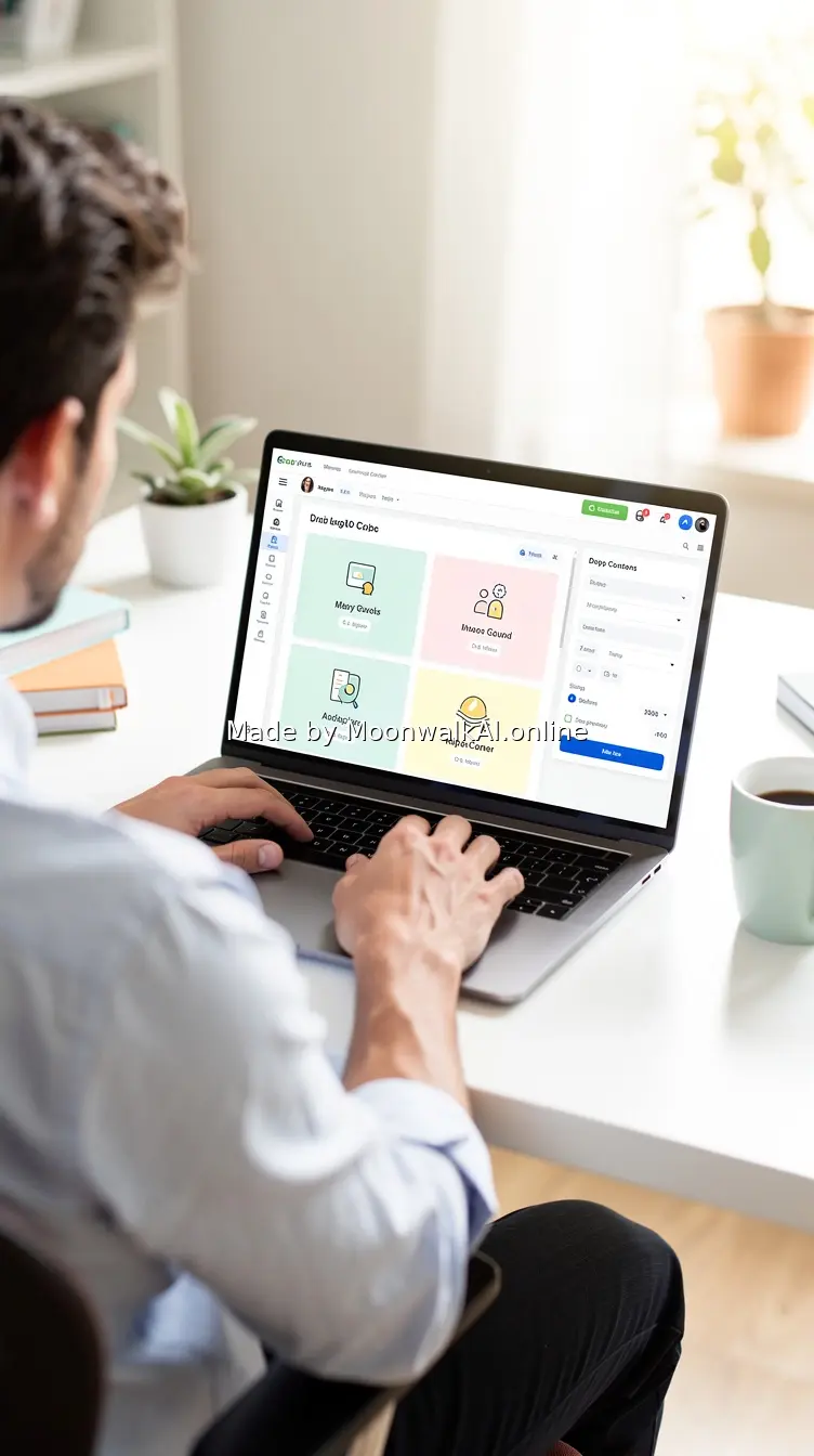 A regular person confidently using a simple drag-and-drop website builder on their laptop, with a friendly and approachable setup
