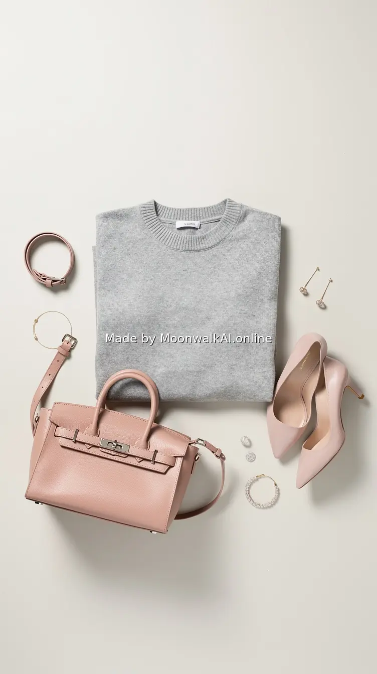 Photorealistic outfit arrangement with gray knit sweater and blush pink accessories, soft diffused lighting, modern minimalist aesthetic, gentle pastel tones, clean and contemporary styling