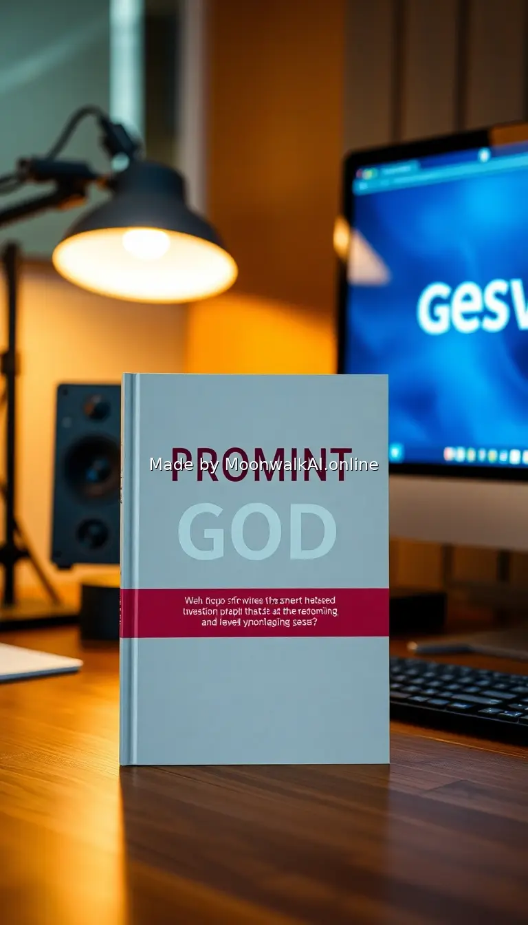 Clean shot of Prompt God book cover on modern desk with studio equipment subtly blurred in background, professional product photography style, warm inviting lighting, website URL visible on screen in background