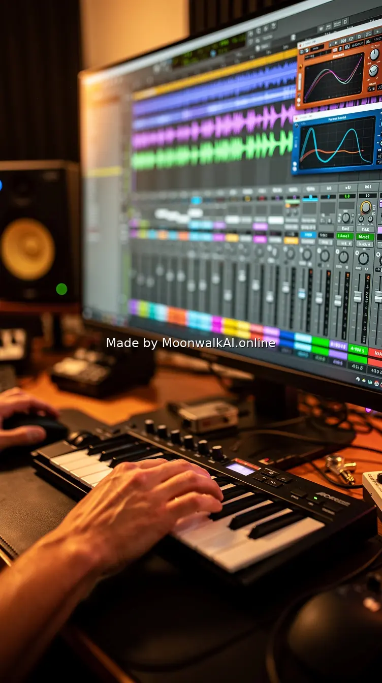 Close-up shot of hands on MIDI keyboard and mouse working in professional DAW software (Ableton or FL Studio interface visible), colorful waveforms and plugin interfaces on screen, studio monitors in background, warm studio lighting, shallow depth of field focusing on hands and screen