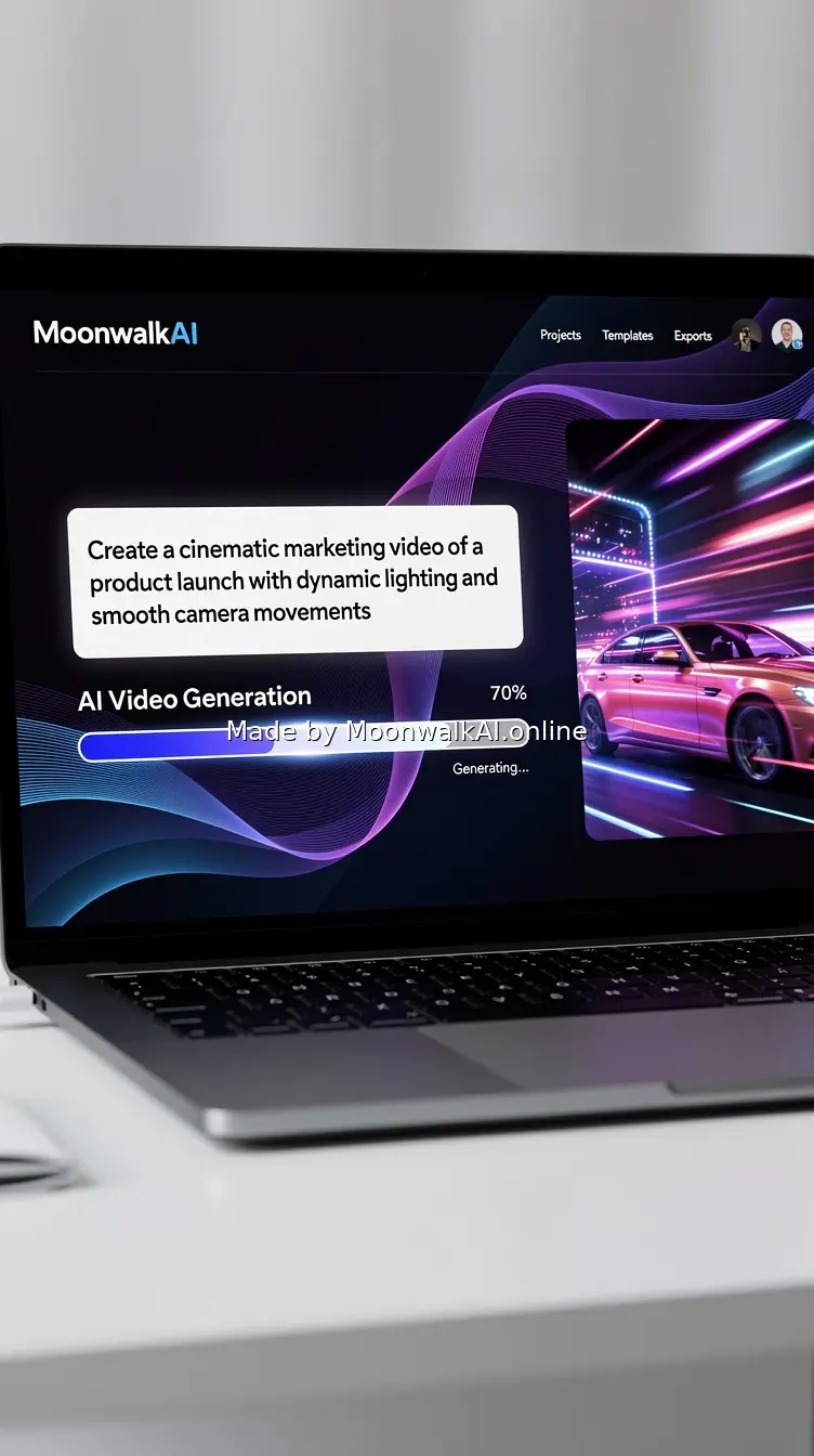 Photorealistic screen recording style image showing MoonwalkAI interface with text prompt being typed, AI generation progress bar, and stunning video preview emerging on screen, modern UI design with purple and blue gradients, professional software interface aesthetic