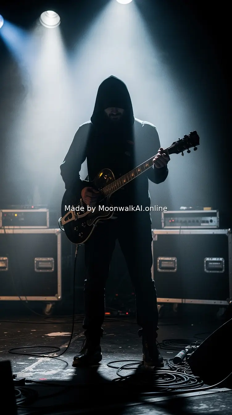 Mysterious figure in shadow holding a guitar, only partially illuminated by stage lights cutting through darkness, backstage concert atmosphere with authentic gritty texture, photorealistic with cinematic depth