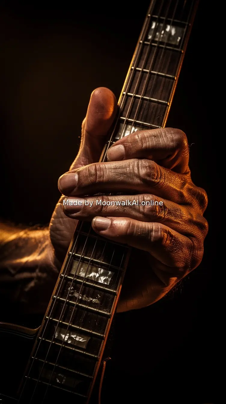 Close-up of weathered hands gripping an electric guitar neck in dim, moody lighting with shadows casting across metal strings, shot from a low angle creating dramatic intensity