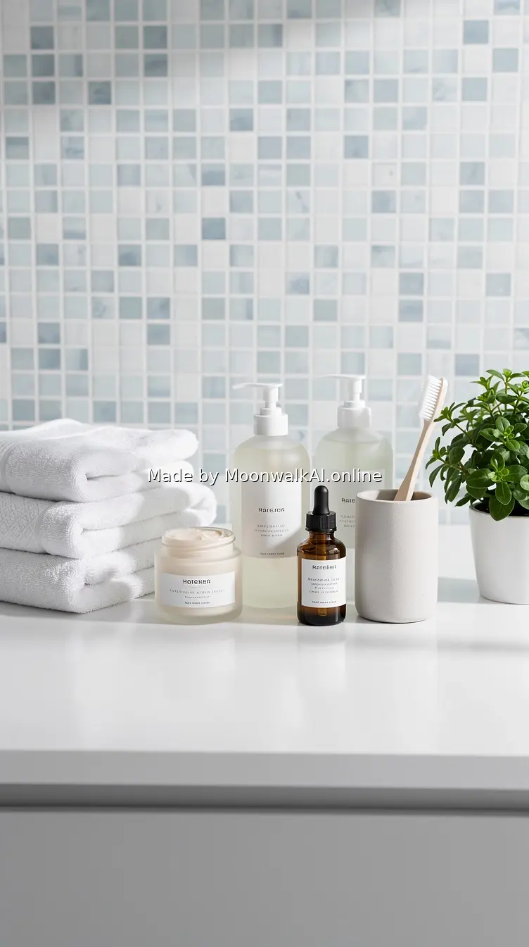 Clean, minimalist bathroom counter with wellness products, soft towels, and gentle lighting, emphasizing cleanliness and self-care in a non-explicit, health-focused manner