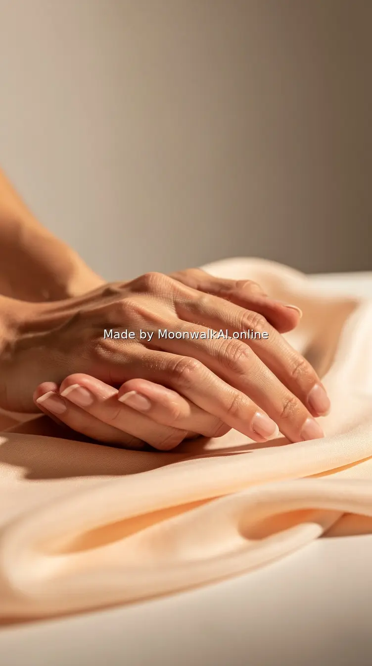 Artistic close-up of hands in a gentle, relaxed position against soft fabric, photographed with shallow depth of field and warm, diffused lighting to convey tenderness and self-care