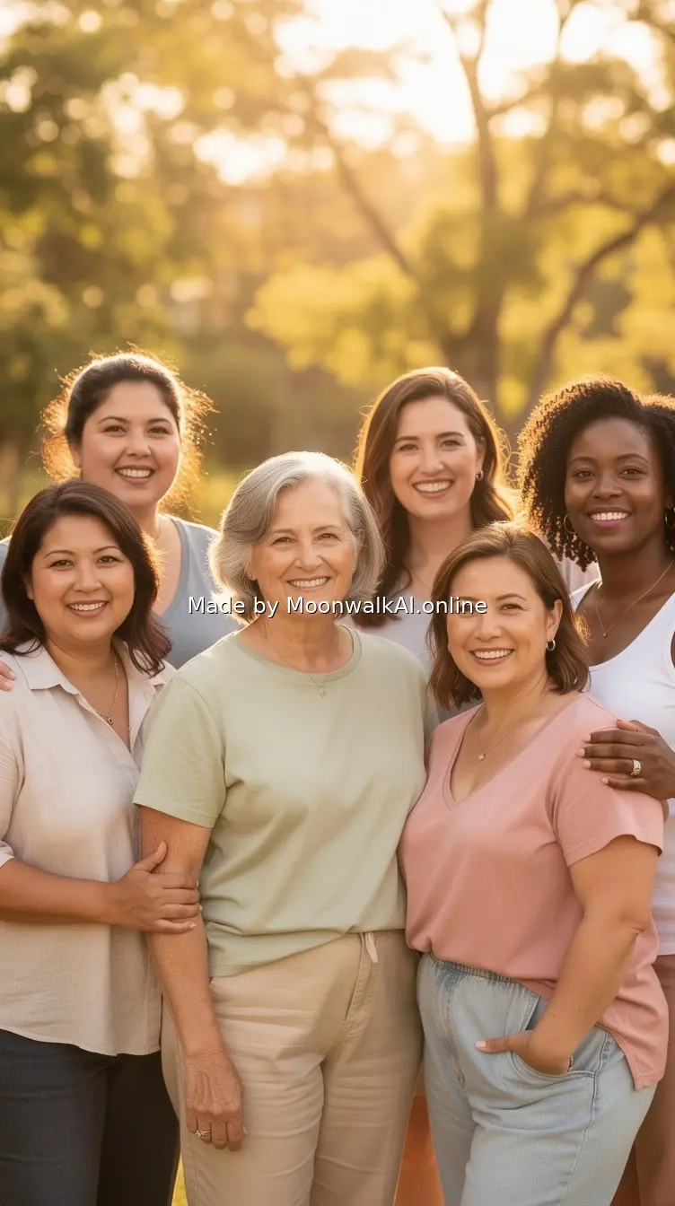 Diverse group of women of different body types, ages, and ethnicities standing together confidently in comfortable clothing, smiling genuinely. Natural outdoor setting with soft sunlight. Celebrating diversity and authentic beauty.