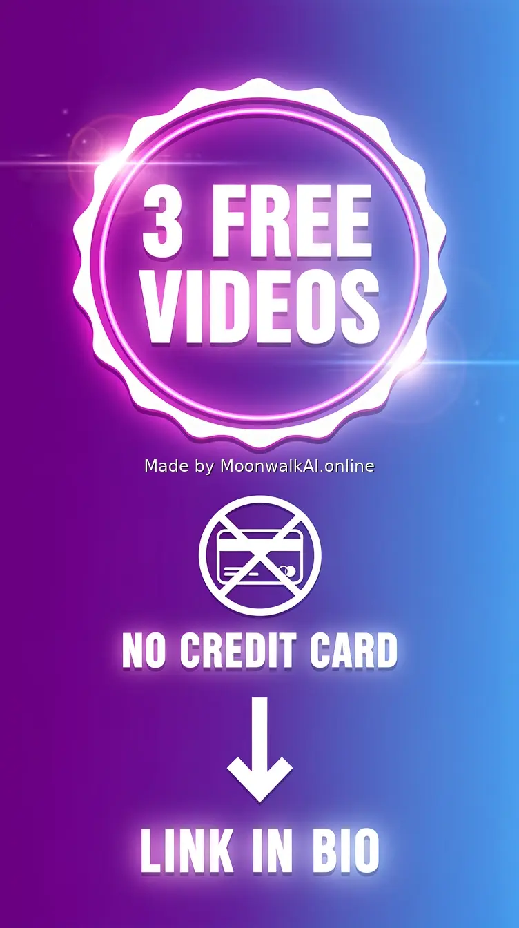 Bold, eye-catching graphic with large '3 FREE VIDEOS' text in center, surrounded by glowing badge or seal design, with 'NO CREDIT CARD' crossed out credit card icon below, and prominent 'LINK IN BIO' arrow pointing down, clean gradient background from purple to blue