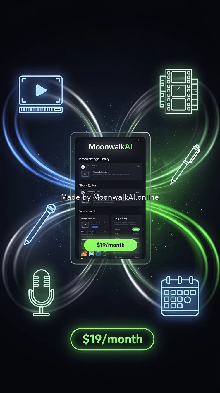 Dynamic composition showing five scattered tool icons (video editor, stock footage library, microphone for voiceover, calendar for scheduling, pen for copywriting) being pulled by glowing lines toward a centered MoonwalkAI logo or sleek app interface mockup, with a prominent $19/month price tag in bright green
