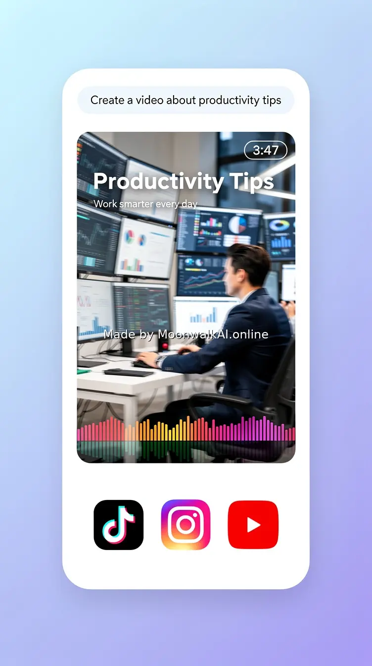 Clean screen recording style mockup showing a simple text input field at top with typed sentence 'Create a video about productivity tips', then below it a stunning finished vertical video frame displaying dynamic action scene with overlaid text, waveform indicating audio, and multiple platform icons (TikTok, Instagram, YouTube) at bottom, with a prominent '3:47' timer in corner