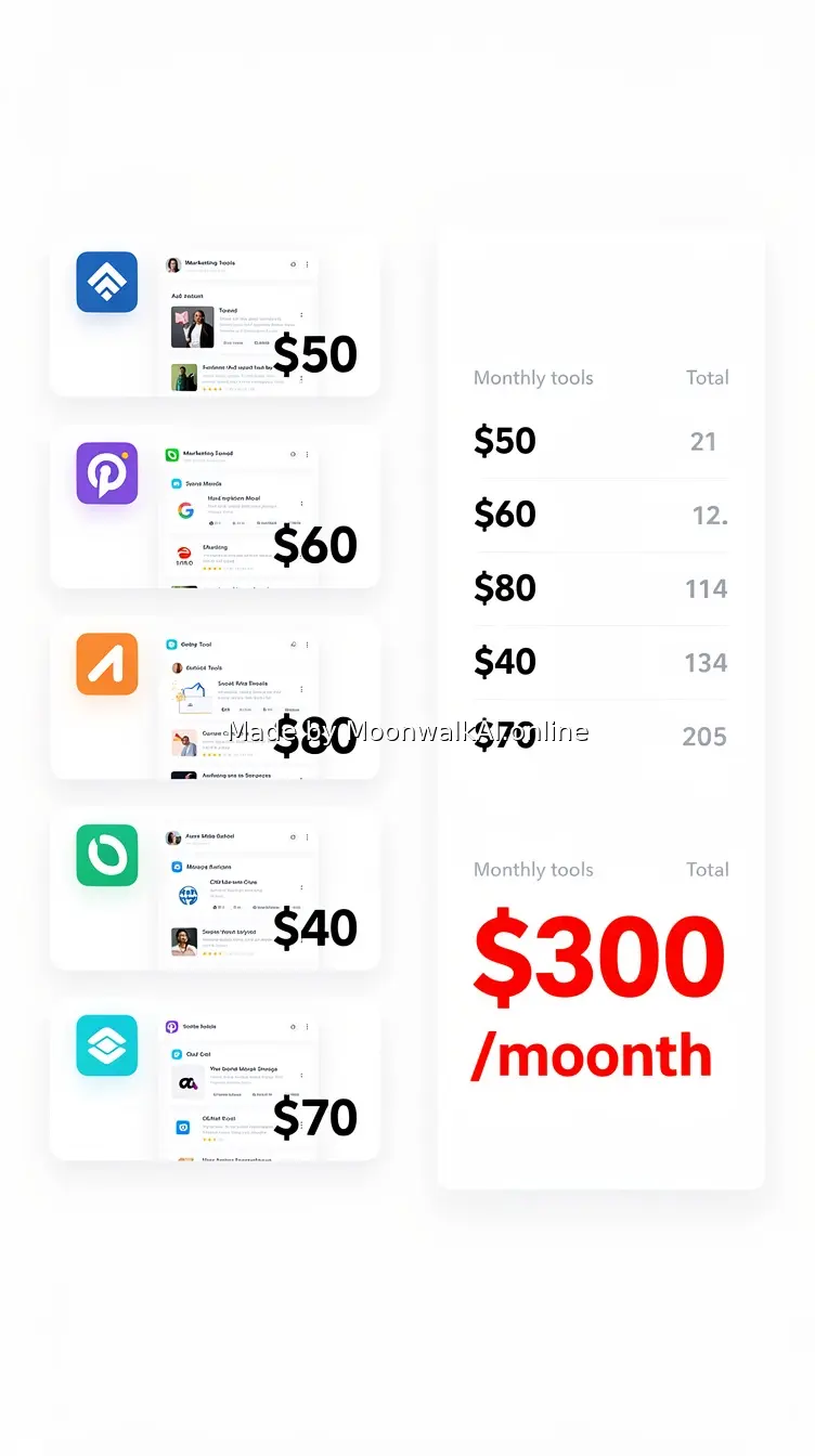 Split-screen composition showing five common marketing tool logos or subscription payment screens stacked vertically on left side, with dollar amounts next to each ($50, $60, $80, $40, $70), and a clean calculator or receipt visual on right showing total $300/month in bold red numbers