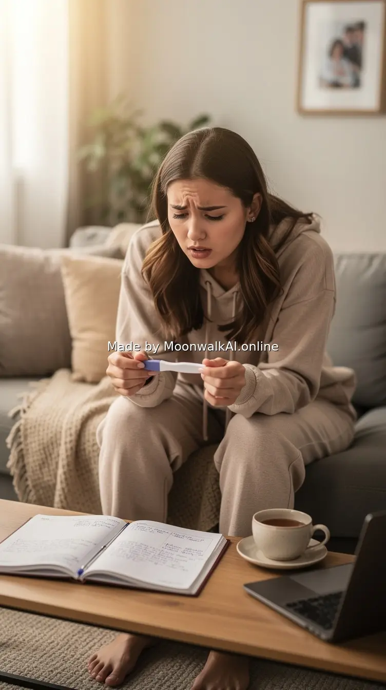 A thoughtful young woman sitting on a couch, looking at a pregnancy test with a confused expression. Natural home setting with soft afternoon light. On the coffee table are various items suggesting normal daily life - a planner, tea cup, laptop. Her body language shows uncertainty and contemplation. Photorealistic, documentary-style authenticity.