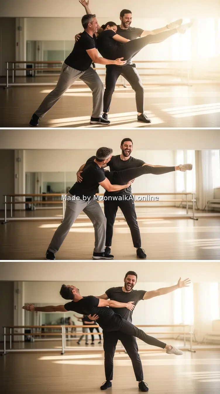 Split-screen or progression montage showing three stages: First panel shows a low practice lift with both men looking uncertain. Second panel shows medium height with more confidence. Third panel shows the full successful lift with both men celebrating with huge smiles. Dance studio setting consistent throughout. Natural progression of skill development visible.