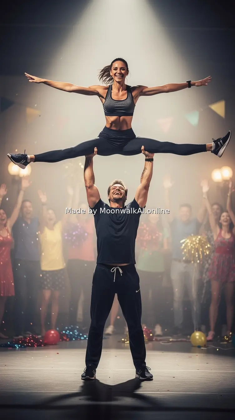 Perfect execution of the Dirty Dancing lift in full glory. The runner is suspended horizontally in mid-air with arms fully extended in the iconic pose, huge smile of triumph. The lifter below has arms fully extended upward, also smiling with pride and joy. Studio lighting creates a slight halo effect around them. Background slightly blurred with visible celebration energy.