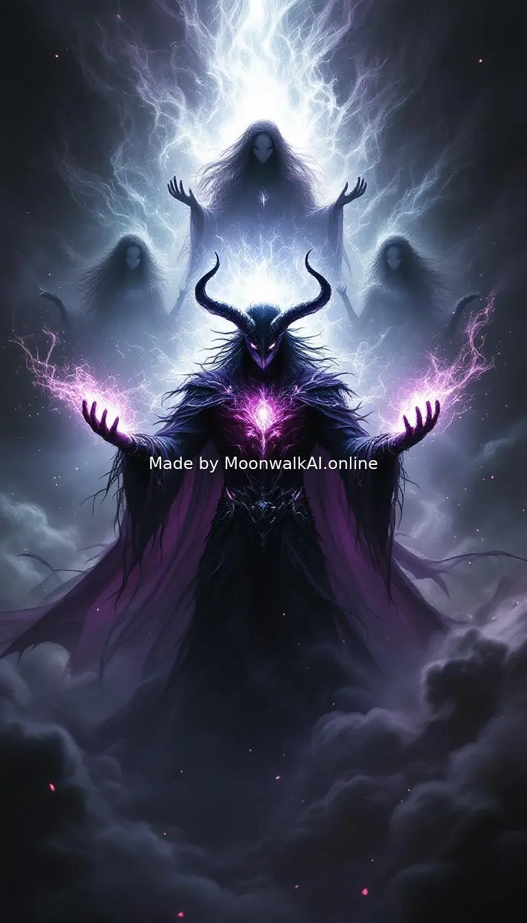 A powerful scene showing Kraven with glowing hands raised, dark smoke and chaotic energy swirling around him in intricate patterns. Behind him, the twin sisters Kravinia and Jorjia mirror his pose with their own smoke magic manifesting. Above them, ethereal silhouettes of two divine beings - the Chaos God wreathed in dark energy and the Smoke God formed of wisps - watch over them. The scene conveys divine heritage and immense power.