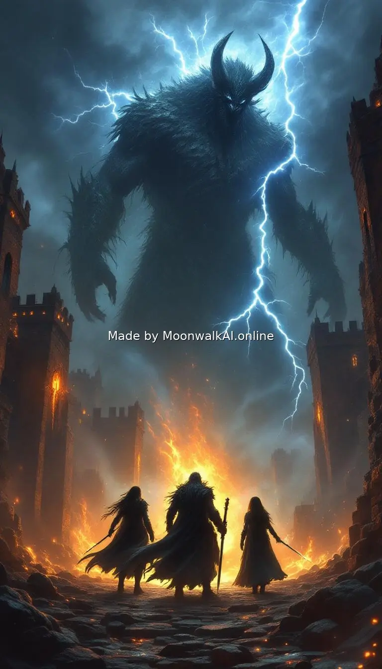 An intense battle scene with Kraven and the twin sisters facing a massive ancient demon or god-like entity. Dark storm clouds swirl overhead, lightning cracking through the sky. The three heroes stand united with weapons drawn and magic blazing, facing impossible odds. Behind them, their kingdom's walls glow with protective magic. The scene is dramatic and shows the high stakes - shadows of betrayal, political intrigue symbols, and the weight of difficult choices visible in the atmospheric tensi