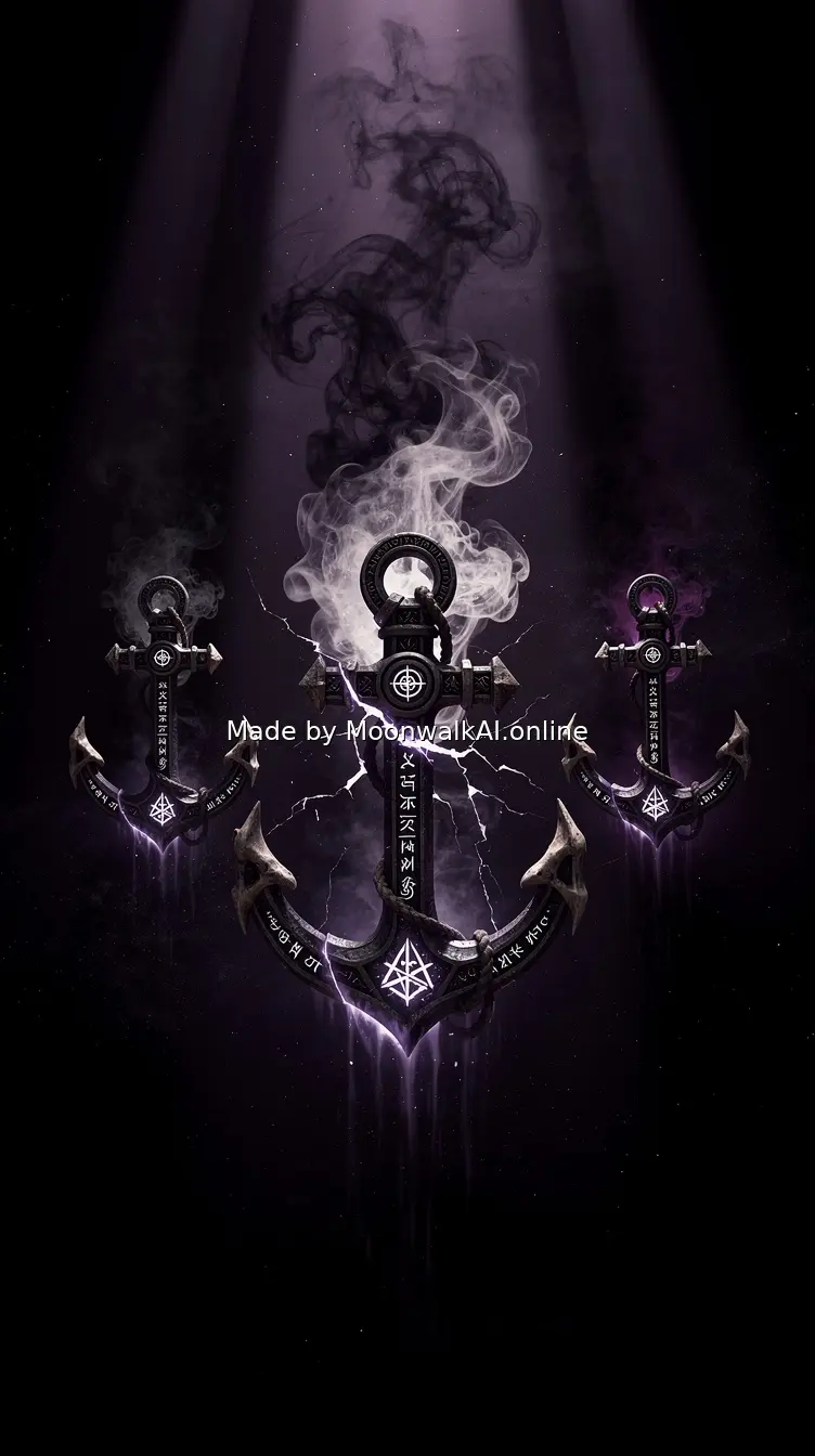 Three ethereal soul anchors floating in darkness, the middle one cracked and leaking smoky essence, photorealistic dark fantasy style with volumetric lighting