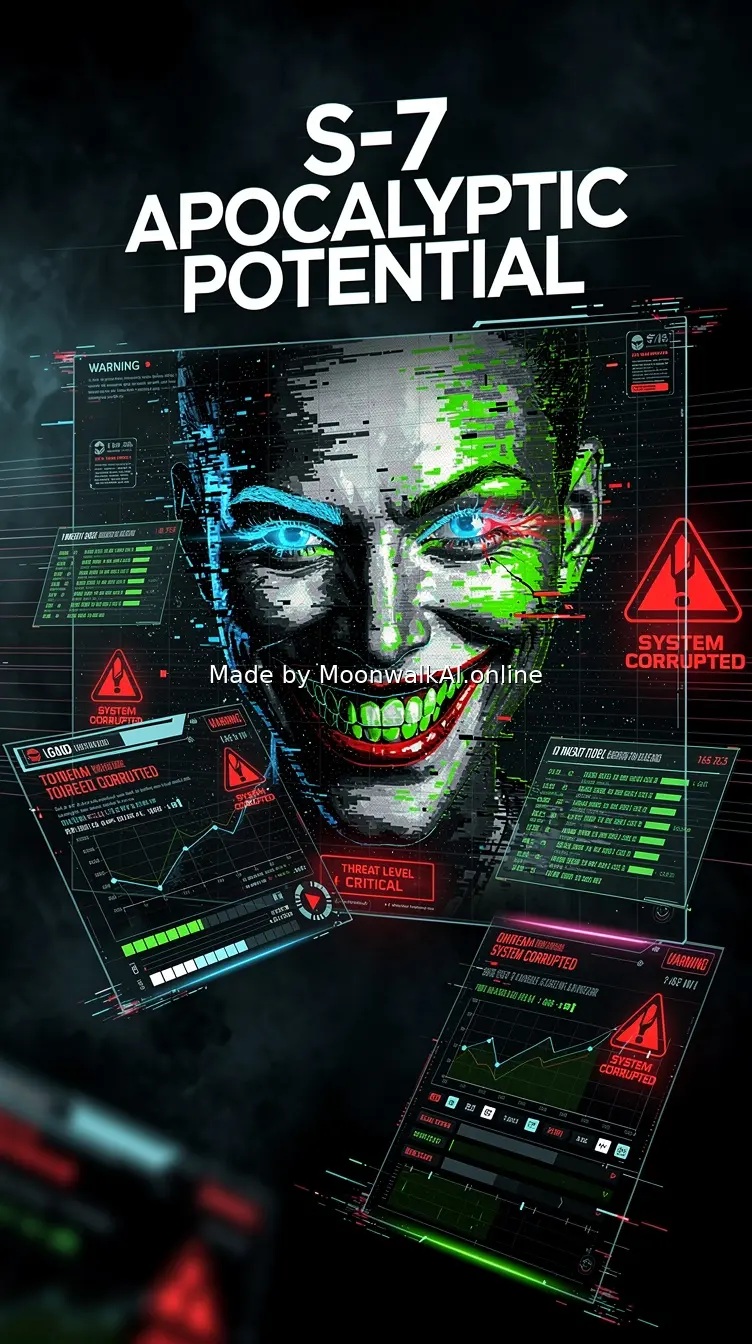 Glowing holographic interface displaying 'S-7 APOCALYPTIC POTENTIAL' with a sinister smiling digital face in the corner, surrounded by floating corrupted stat windows and warning symbols, cyberpunk dark fantasy aesthetic